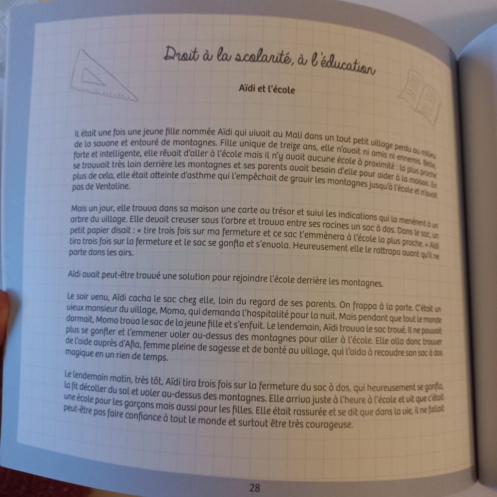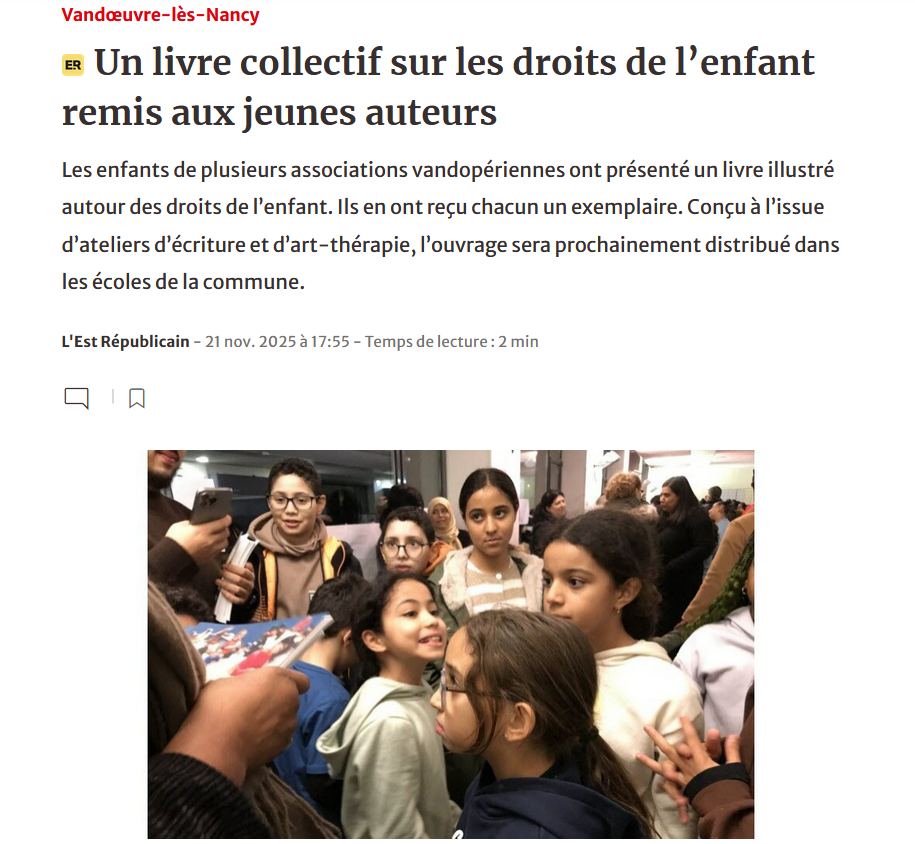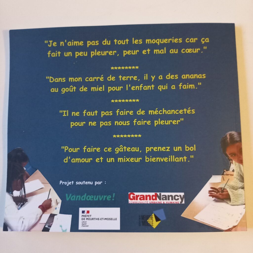 Livre issu des ateliers d’écriture que j’ai menés avec les enfants de la ville de Vandoeuvre dans le cadre de la Convention des droits de l’Enfant dans plusieurs structures socio-culturelles de la ville : Croq-espace, Club Arlequin, ATMF, Tricot couture service, MJC Etoile, Mjc Nomade, MJC Lorrain. J’ai proposé des exercices d’écriture créative variés en lien avec les thème de la Convention choisis par chaque structure : le haïku pour le thème de l’environnement, le slogan pour le thème du droit à l’information et à la expression, un conte pour le droit à la scolarisation, etc. Les textes ont été illustrés en ateliers avec Karine Maincent. Le livre est disponible à la Médiathèque de Vandoeuvre et dans les écoles de la ville.